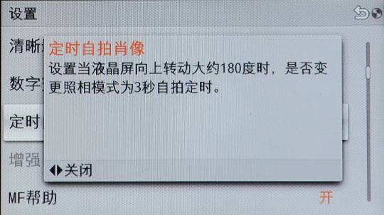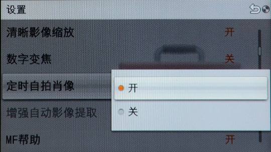 前文提到NEX-F3翻起液晶屏时,可设置自动进入定时(3秒)自拍模式,机内可对该设置开关。