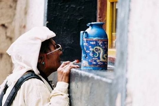 我在小昭寺的门口等待了很久。她蹒跚地来到这里朝拜。我不知道她走了多少路,叩拜了多少个头才来到这里,我也不知道她要祈求的是什么愿望,但我在企盼她能出现在我的镜头里。而她趴在窗台上时,我是感动的,因为她的虔诚。