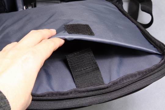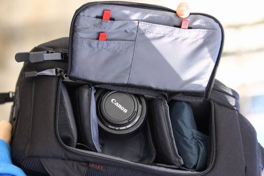 再往里则是器材放置仓,前文提到键盘存储层背面便是有厚垫保护储存格,适合摆放iPad或10英吋上网本。该存储格后面则是放置器材的地方。可以摆放配备16cm长镜头的数码单反(中端单反加24-105mm可以放下),额外3-4支镜头(包括70-200mm f/2.8 )和闪光灯。