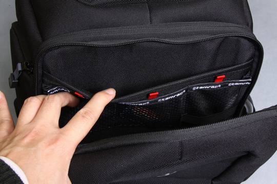 打开背包前面里面透明网格口袋可容纳摆放转接器、记忆卡和电池等配件。