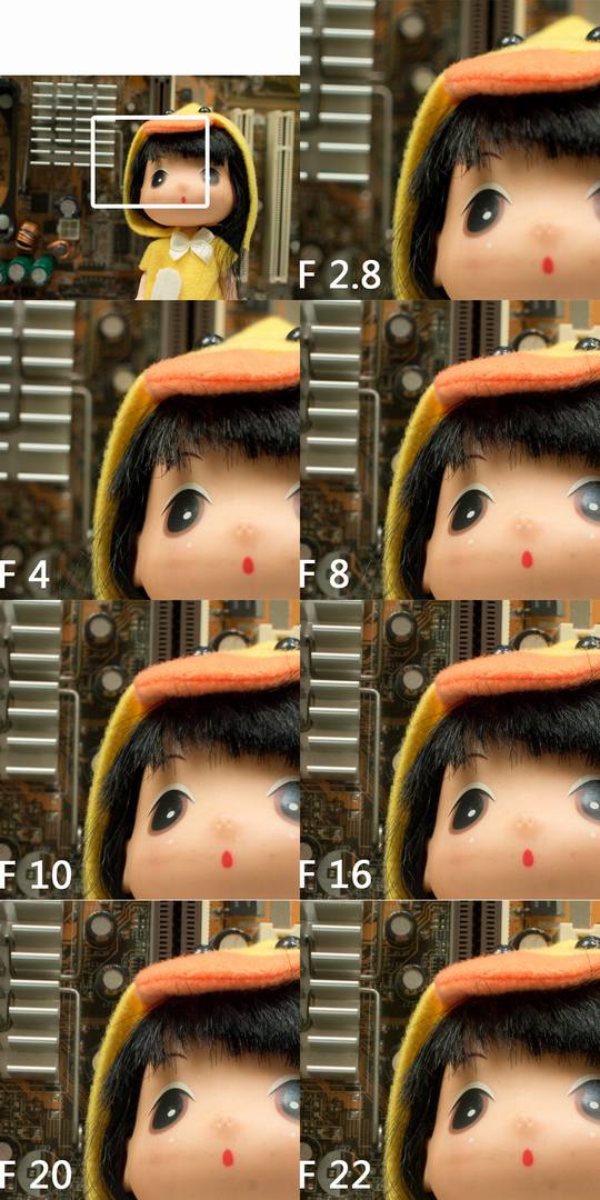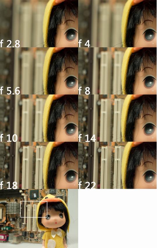 通过对比发现,这颗镜头的素质还是非常之高的,全开最大光圈F2.8完全可用,头发丝的“丝”清晰不含糊,如果换做性能更高的后备机身也许还能表现的更好,随后的几档光圈差别不大,只是在最后F20以后素质有所下降,但是这个光圈数值显然不是平时经常使用的,基本可以无视。充分利用F16以下的光圈作为拍摄效果应该不错。看来适马在定焦镜头的研究方面确实取得了不错的功底,从单反镜头受到很大欢迎的50 F1.4开始到后来的85 F1.4,相信适马也会越做越好。无反镜头的开卖也拓宽了一定用户的视野。