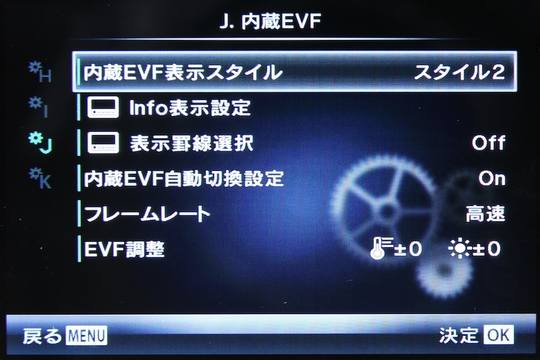 并且,内置电子取景器设置了独立菜单,各种矫正效果、艺术滤镜效果可在电子取景器内确认。EVF的图像延迟时滞提供“标准”和“高速”两种模式选择,高速模式时,图像延迟时滞缩短至0.03秒。