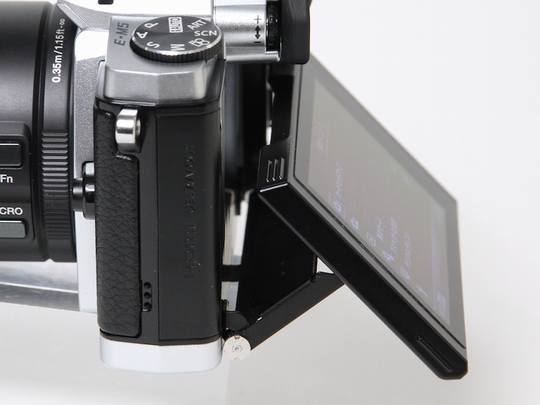 机身背面采用3.0英寸可翻转OLED显示屏,具有61万像素,采用静电电容式触摸屏,能使对焦、照片浏览、白平衡等拍摄参数调节变得简单快捷。并且可以进行向上80度、向下50度的翻转,能适应更多场景的拍摄。