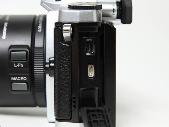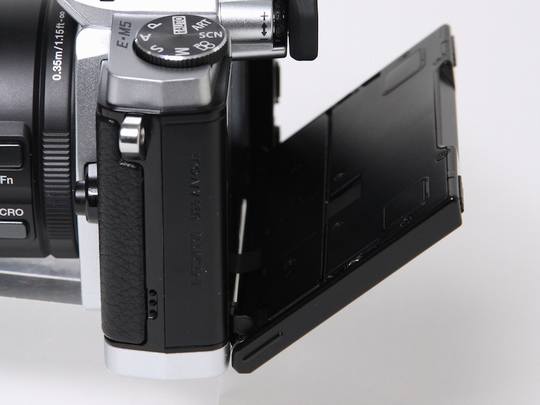 E-M5和E-410一样采用了略微凸起合成皮革包括着的的握柄,有点松散的皮质使用时更具手感。如果说右手抓握时感到拘谨的话,机身背面还设计了拇指拿捏点,所以手持稳定性和手感也极为舒服。