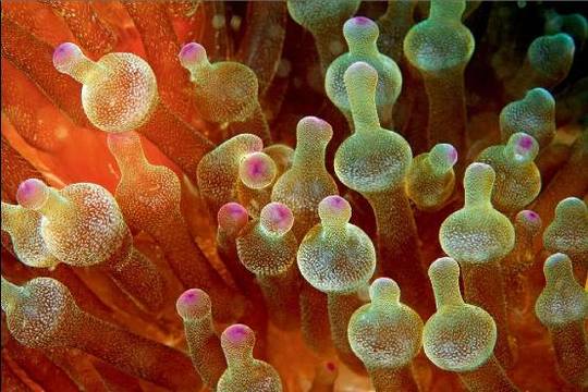 印尼Wakatobi// 奶嘴海鞘 奶嘴海鞘和珊瑚一样,都是海洋动物。很多没有摄影基础的潜水员往往会会忽略这些光影色彩非 常明丽的小东西。对于摄影师来说,这样的场景就是海底的一场关于色彩韵律构成的表演。