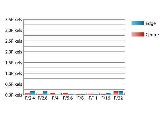 暗角控制得不错,光圈为f/2.4时,边缘部分比画面中央要暗0.896,在f/4时暗角就几乎消失不见了。