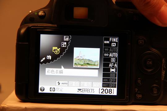 彩色素描 相机侦测出彩色素描效果的轮廓并给其添加色彩。用户可使用显示屏显示调节色彩的生动性以及轮廓的厚实度。动画录制过程自动对焦不可用。