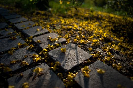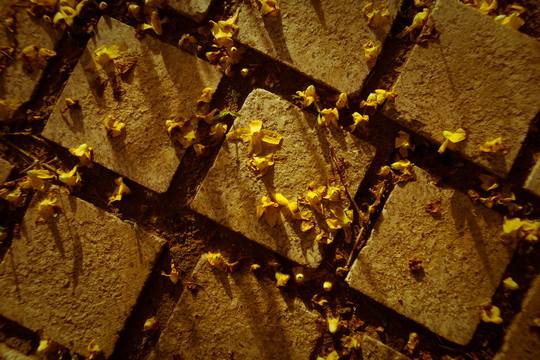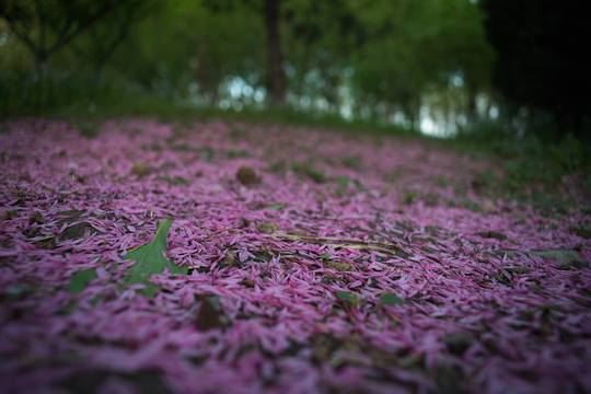 刚下过雨,又刮起了大风,花瓣如同有毒胶囊一般,撒了一地。