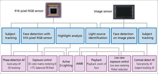 尼康D4首次搭载该系统,支持高级场景识别系统,可在光学取景器拍摄中实现面部检测。利用面部检测信息和详细的场景分析信息,它可准确控制自动化功能,如AF、AE和自动化白平衡。而且 ,它有助于改善捕获完美拍摄主体的3D追踪性能。