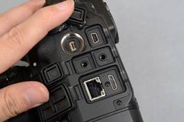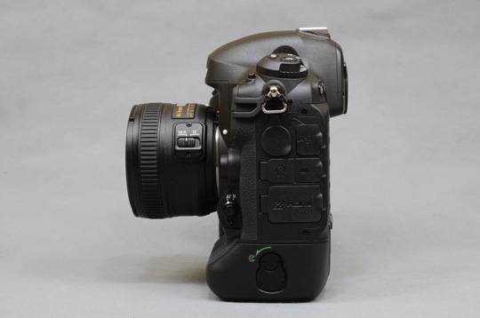 接口方面,尼康D4与此前机型一样,正面胶皮盖下为闪光同步端子和10针遥控端子(后者与连接GPS附件有关)。但与D800等机型不同,正面没有对焦辅助灯,仅有自拍指示灯。侧面接口为外置麦克风接口、USB(2.0)、耳机接口、HDMI。D4虽然没有支持USB 3.0但内置以太网端口(伦敦奥运会要求),通过有线网传输,速度也很快。网线口可以说是D4、EOS 1DX这代奥运机身上的时代烙印。