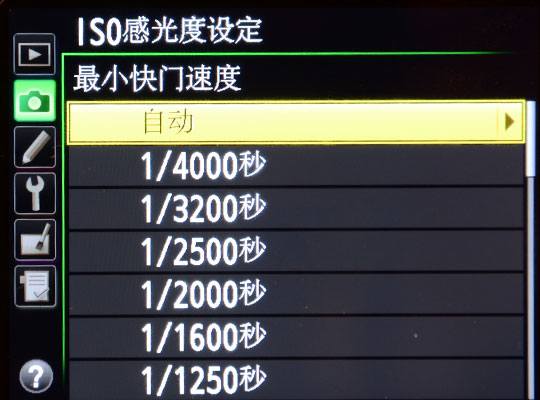 尼康D4与D800(E)相同,内置感光度设定中有自动快门选项,可基于所用镜头的焦距自动控制最小快门速度和ISO感光度的组合。当装配远摄变焦镜头时,相机可根据所选焦距自动选择能将照相机模糊降至极低的快门速度。其原理就是“手震临界”,快门为焦距倒数。