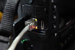 据说2012伦敦奥运会在赛场并不提供官方无线网络给新闻记者,而密集的无线网络是存在干扰问题的,尼康和佳能都在新奥运机上加了标准RJ45网线接口。相机可通过内置以太网端口或者(另购)WT-5/WT-4无线传输器以以太网络或无线网络(以太网连接时需要使用以太网连接线)。以下为简单操作过程:
