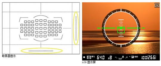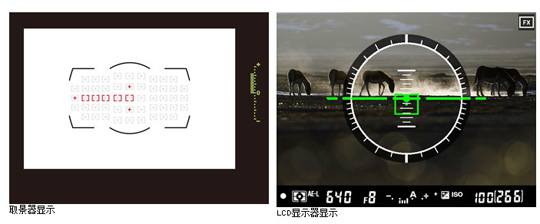 D4在两个水平维度(两侧及前后)均采用位置侦测,使用LCD显示屏时以5度为增量调节,使用取景器时以1度为增量调节。不过我们要注意D4取景器的显示方式与D800(E)不同,D800(E)是在对焦区域的下方和右侧,而D4水平的显示由焦点框显示。D800(E)取景器内的水平仪采用透过型的液晶来显示。