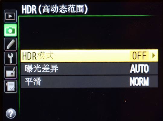 尼康从D5100开始支持HDR功能,能在一次快门释放下以不同的曝光拍摄两张照片:一张曝光过度,另一张曝光不足。然后照相机立刻将两张照片结合,创造出一张涵盖更宽广动态范围的图像。动态范围最高可拓宽3EV,另外两张曝光照片重叠处边缘的平滑度可进行调整。