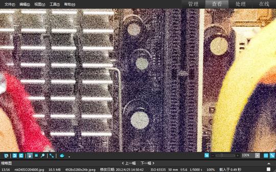 尼康D4的标准感光度范围为ISO 100-12800,还可支持下至相当于ISO 50(Lo 1),上至ISO 204800的感光度。从标准原生感光度范围上限与D3s相当,下限D4达到ISO50(原生ISO 100起跳)。上限扩展ISO 204800。ISO 100开始,某种角度可以印证这款相机低感画质相比上一代更为出色。我们将尼康D4设置为RAW(无损压缩)+JPG、矩阵测光、预设白平衡、焦距50mm、光圈f5.6。PS自带 Adobe Camera RAW6.7将RAW转JPG。