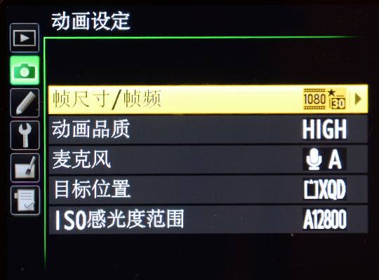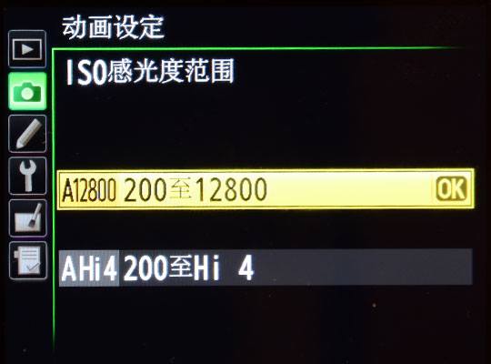 在短片设定当中,尼康D4增加了ISO规范广度范围(D800没有该选项),可选择短片记录过程中可用的ISO范围,如A12800(ISO 200-12800)、AHi4(ISO 200-Hi4)。拍摄动画短片时该机支持全时伺服AF(AF-F)和单次AF(AF-S)。