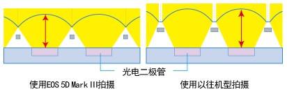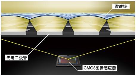 光电二极管是CMOS图像感应器内部将接收自镜头的光转换为电子信号的部分。为了将光集中到光电二极管上,图像感应器各像素表面配置了微透镜。EOS 5D Mark III的CMOS图像感应器采用了通过消除相邻微透镜之间间隙、提高开口率的无间隙微透镜技术。加上缩短微透镜到光电二极管之间的距离,更加提高了聚光率。而且EOS 5D Mark III的无间隙微透镜还能对应画面中央和周边部不同的光线入射角度。通过针对各位置配置形状适合的微透镜,使各像素都能高效聚光。通过这些技术上的改善,增加了可以转换为电子信号的光量,提高了信噪比。