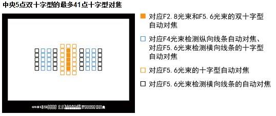 61个自动对焦点中的41点采用呈十字型配置的自动对焦感应器。十字型自动对焦感应器是指将线型自动对焦感应器横竖重合配置,1点由两组感应器对焦,能够更精确地捕捉被摄体。加上使用频率高的中央5点十字型对焦点与斜向配置的精度更高的对应F2.8光束十字型自动对焦感应器重合,实现双十字自动对焦。