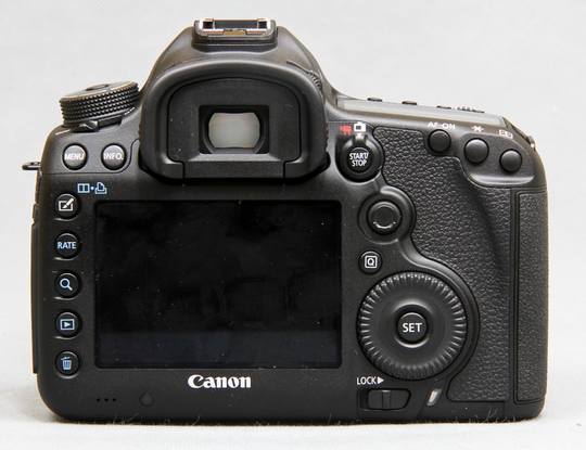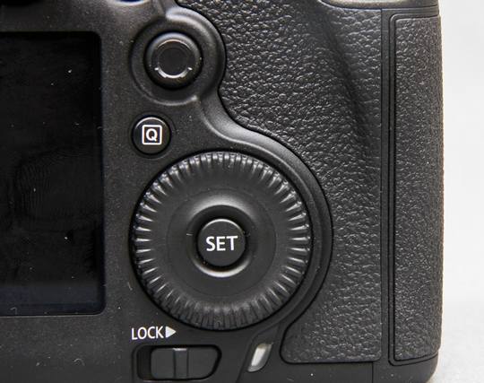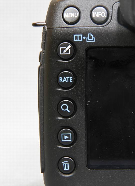 此次5D III在液晶屏的左边安排了5个按键,这五个按键中的四个都与图像回放有关系,与5D II最大的不一样之处在图像的回放浏览方式上,原先的5D II是通过大拇指处的对角点选择按键和曝光锁定按键放大缩小观看图像,5D III则改成了点按回放键用食指拨盘来选择,这让早已习惯佳能单反使用习惯的用户多少得适应一小段时间。转盘处5D III上方多了一个Q键,可以快速的进入参数调整菜单进行设置,方便了很多。