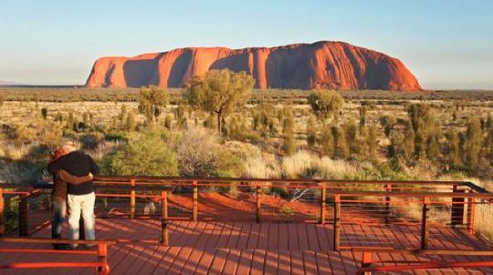 晨曦中,我们和乌鲁鲁一起迎来了新一天的日出。乌鲁鲁(Uluru)是澳洲的骄傲,是世界上最大的一整块岩石,也是澳洲中部阿纳古土著人的神圣之物,被联合国教科文组织认定为世界文化和自然双遗产。据说在1873年,一位名叫威廉•克里斯蒂•高斯的南澳州测量 员横跨荒漠,饥渴困顿交加时仰首看见这座神奇的巨石,竟然以为撞见海市蜃楼,当他清楚地意识到这的确是一处自然奇观后兴奋不已。高斯赤着脚往山顶爬,磨得两脚血 泡模糊,疼痛难忍,到达顶峰后他激动地喊道:“我值了!美景报偿了我。”在这天清晨,乌鲁鲁在渐渐爬高的阳光照射下,渐渐出现棕红、橘红、浅红和橙色的变化。在游客汇成的人潮褪去之后,这对忘年恋人留下来享受此刻难得的静谧。
