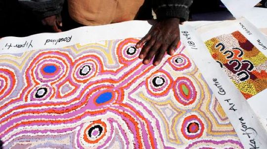 爱丽丝泉(Alice Spring)的“沙漠大集”每年举行一次,来自十里八乡的土著艺术家都来参加这个艺术品交易“跳蚤市场”。这些艺术品标价不菲,往往一张油画要买到几十到几百澳币之间,贵的甚至达到几千澳币,合人民币几万元。这位土著艺术家按看了看这幅画的尺寸,然后告诉我它标价300澳币。土著艺术看上去十分抽象难懂,但背后的故事非常简单——是土著人对观察到的沙地上留下的痕迹的模仿——袋鼠的脚印、野狗的脚印、沙漠中的水源,以及男人与女人席地而坐留下的臀印,都是土著艺术家绘画的主题。