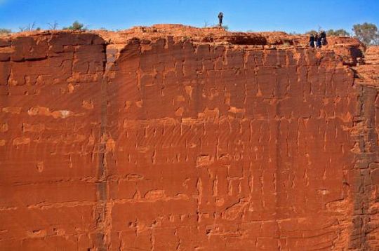 帝王谷(King's Canyon)形成与一个漫长的故事有关:大约三亿五千万年前,地壳运动压迫了砂岩造成细小的裂缝。这些小裂缝在风和雨水的作用下,日积月累不断发生着变化,最后变成了今天的峡谷。西班牙人Jack Cotterill是探索帝王谷的先驱者,发现=帝王谷之后,他跟儿子Jim和一位这里的土著人一起,用铁丝捆住枯树枝和石板扎成一座小桥,搭在一道人难以跨越的裂缝上,通往景色绝美的峡谷边缘。从这里用70-200mm的长焦镜头可以拍摄到峡谷对岸游客的活动。今天这座著名的小桥已经因为风化作用掉落卡在裂缝中,但Jack当年的探险精神正是我们得以欣赏今日美景的第一步。