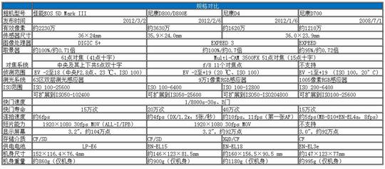 尼康D800可以说是不少尼康用户期盼已久的产品,2008年佳能尼康分别发布自家中端全画幅单反5D MarkII和D700,5D MarkII凭借1080P全高清短片和可媲美1Ds MarKIII的2100万像素,赢得一片好评。似乎上一次交锋让尼康明白像素的重要性,4年后尼康推出D800有效像素是上代产品3倍!从这点变化上不难看出,D800与D700的定位明显不同,可以说完全是两个路线。D800并非D700后继机型,更像是尼康版“5D MarkII”。下面我们不妨看看尼康D800与同门尼康D4、D700还有竞争对手佳能EOS 5D MarkIII规格对比:
