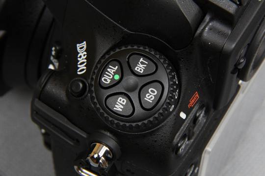 尼康D800在细节设计上多数还是沿用D700。值得注意的是拍摄模式转盘与D700不同,并非叠加式而是包含式,显得更具整体感。另外D700的拍摄模式拨盘中只有三个按键(QUAL、WB、ISO),这次增加了包围曝光键(BKT),共有四个按键了。这个包围曝光键,还可以设成HDR、多重曝光等功能用。
