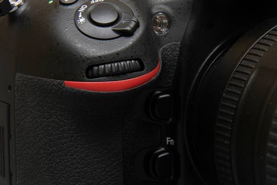 三围和重量方面,D800是146×123×81.5mm机身900g,上代D700为147x123x77mm机身995g,变化比较大在厚度和重量上,体积略有增加,但重量却有所下降。另外手柄处尼康标志性的“红裤衩”,也逐渐拉长拉细,快成“红飘带”。我们还要注意一个细节,以前的“红裤衩”是在手柄胶皮上,前拨轮处在胶皮和金属之间,这样设计比较容易造成脱皮,而新的设计前拨轮开槽在金属部分,“红飘带”处在金属和胶皮之间。当然除了整体外观上的改变,在细节上也有很多变化。