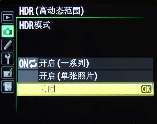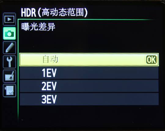 尼康从D5100开始支持HDR功能,尼康D800自然也不例外,能在一次快门释放下以不同的曝光拍摄两张照片:一张曝光过度,另一张曝光不足。然后照相机立刻将两张照片结合,创造出一张涵盖更宽广动态范围的图像。动态范围最高可拓宽3EV,另外两张曝光照片重叠处边缘的平滑度可进行调整。