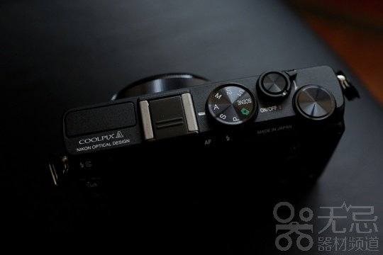 顶盖上除了标准热靴和弹出式闪光灯外,另有三个圆形拨轮,分别是模式转盘,配合功能键的拨轮和快门按钮。相机开关也集成在快门按钮上。顶盖边上印着醒目的"MADE IN JAPAN"。这个产地标识通常印在机身底部,COOLPIX A放在顶上显然是想强调其本土生产的高品质。