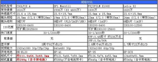 APS-C画幅便携相机,目前市面上存在变焦镜头和定焦镜头两个大类,由于在体积和画质上要取得一定的平衡,大多数APS-C便携相机都采用定焦镜头。像佳能Powershot G1 X、理光GXR A16 24-85mm这样搭配变焦镜头的产品,虽然变焦更为方便但整机体积较大和镜头光圈偏小,让它们处境比较尴尬。而定焦镜头的产品,以28mm和35mm两个焦段为主。下面我们将COOLPIX A与几款同类产品进行对比: