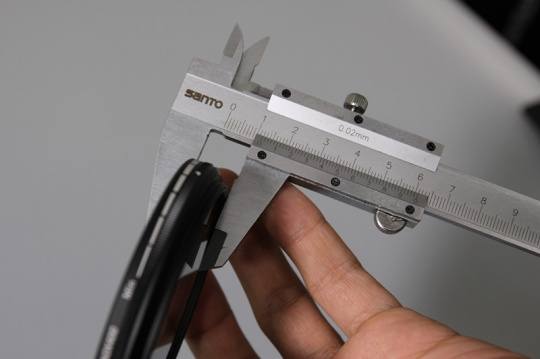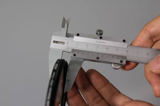 通过卡尺的测量,我们测得品色的这款NDX400滤镜的厚度约10mm,但由于滤镜外径口径要比内径大,因此即使是这样的厚度下,在广角端的暗角效果也不会十分明显。