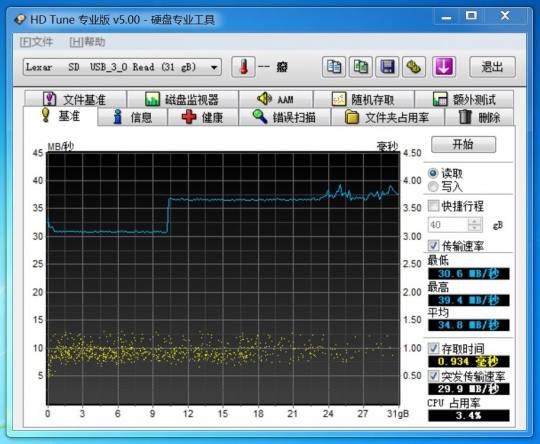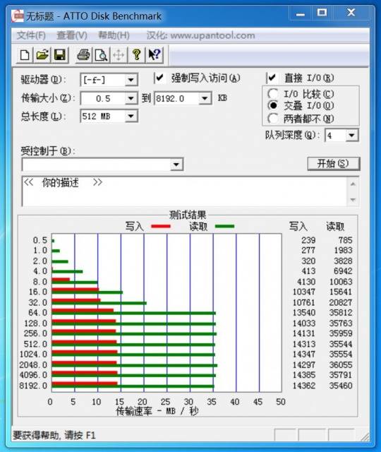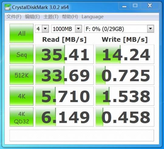 CrystalDiskMark的测试结果和ATTO Disk Benchmark的测试结果非常接近,写入14.24MB/s,读取35.41MB/s。
