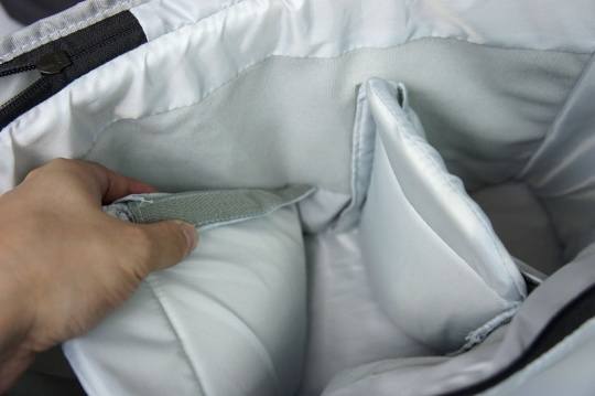 内间隔板厚度大概为15mm,选用高密度珍珠棉填充,可以起到不错的减震防潮效果。间隔板两侧用魔术贴贴合在内胆上,方便随时改变各个间隔之间的尺寸,增加储物的灵活性。
