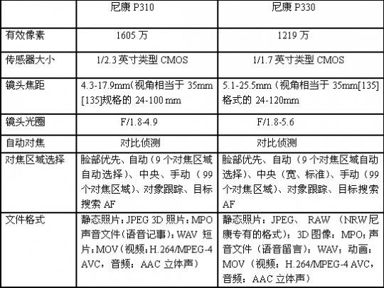 通过尼康P330的配置,可以知道这款机器是主打画质和便携的。它既拥有比一般普通卡片相机更大的传感器,同时又保持了轻巧的机身体积。我们先通过P330与P310的配置对比图来初步认识一下P系列的数码相机。