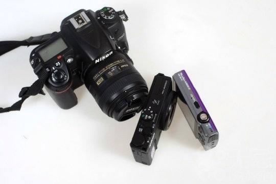 尼康P330的总重量约为200g,属于非常轻量级的选手。在编辑测评过的相机里真算是个小不点了。体积大小也正好可以放到衣服口袋里,非常适合女孩子或者家庭使用。不起眼的外观还可以作为一台街头抓拍机使用。 笔者特意拿来了一台小型卡片机和一台单反与P330对比,可以看出P330比普通卡片要大一点,但这种设计增强了手指的抓握力,又比单反小很多。尼康的设计恰到好处 。