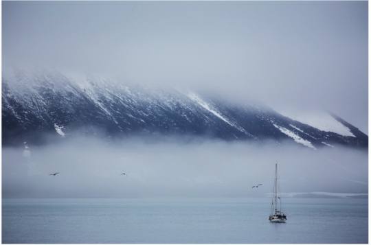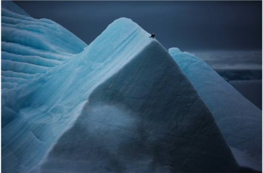 作为摄影师,我们总有这样一个对新奇事物的了解过程——从“拍到”到“拍摄”。如果是第一次进入北极圈,能拍到壮观的冰山、憨厚的北极熊、绚丽的北极光,一定兴奋无比,而且总想用更长的镜头,拍到更精细的细节。但这一切都只属于“拍到”。对于已经7次进北极的“老选手”来说,姜平现在的北极作品,传达出的更多是一种宁静致远的情愫与思绪。在苍茫冰川上一头郁郁独行的北极熊;冰山刃脊上一只孤独眺望的小鸟;水天之际一行渺如点墨的海鸥……抛弃了缤纷的色彩,姜平选用一种青绿的朦胧色调为我们呈现着一个依然神秘却又并不遥远的北极梦。