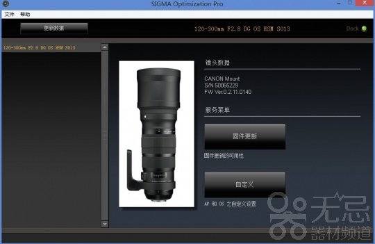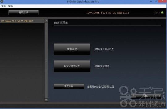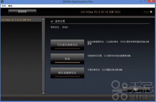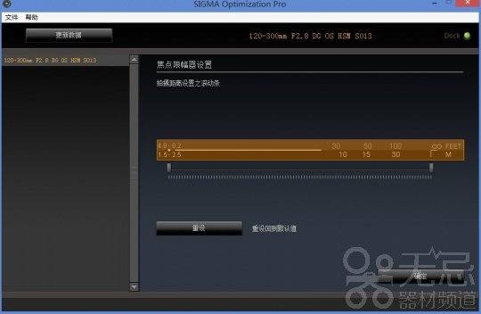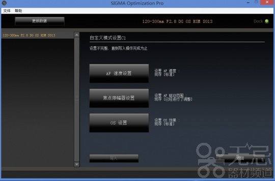这个USB连接槽使用起来非常方便,只要把连接槽安装在镜头卡口,并用USB线与电脑连接即可。点击进入SIGMA OptimizationPro软件就可进行调整。