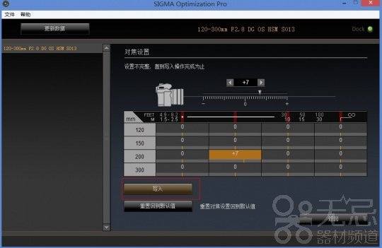 对焦调整就是调校焦点的范围的,这对于跑焦的镜头来说特别好用,当然连接的镜头不同,那么焦段也不一样,这里连接上120-300mm镜头之后,笔者发现可调整的焦段分为4段-120mm 150mm 200mm 300mm。可以说分的非常细。而每一个焦段还可以根据不同的对焦距离进行调校。这基本上就解决了很多机身调跑焦的通病。比如一支镜头在300mm端跑焦,如果用机身调整,300mm调整好,而另外的焦段就会出现焦点偏移。而用这个软件就可以几个焦段分别设置。用户再也不用去售后服务调焦了。自己就可以动手操作,注意调整完成后点击写入就可以了,软件会自动更新镜头的。