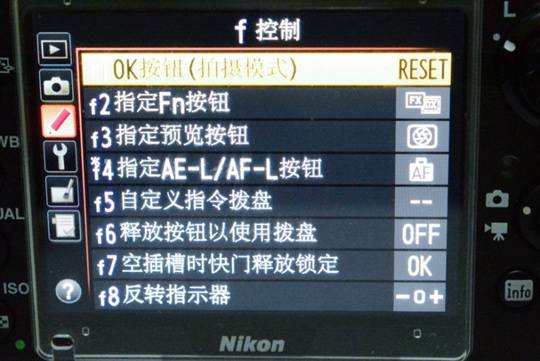 在右侧机身前方有一个多功能的按钮Fn,可以在菜单里指定其具体功能,可选设置多达十几项,诸如闪光锁定,曝光锁定,控制闪光灯关闭,打开取景器内网格线等等,功能非常丰富。图中上方的景深预测按钮也同样可以重新自定义其功能,而后背上的AE-L/AF-L按钮,OK按钮,也都是可以改变其功能的,不同的用户可以将自己最常用的功能合理地安排在这些按钮上(上图菜单中的“f控制”项),“制造”出属于自己的最顺手的一台D600。