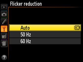 在即时取景或视频拍摄期间,此功能减少诸如荧光灯或汞灯等人工照明下屏幕可能出现的频闪影响和垂直线条。频闪消除菜单中的自动模式可自动识别频闪频率以确保适当的曝光控制以减少频闪。需要时,也可手动选择50赫兹和60赫兹。