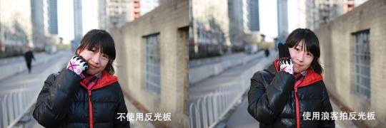 上图为实拍对比图,可以看出,不使用反光板人物的皮肤比较暗淡,人物也不算突出,右图使用了浪客拍反光板,脸上的光线比较均匀,皮肤也更细腻了,使用灯光后,身后的背景也能被闪灯相对压暗下来,人物会更加的突出。