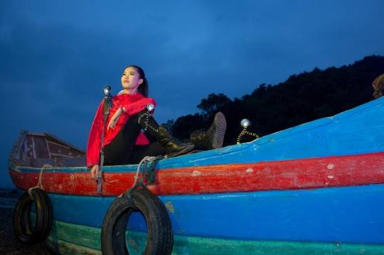 闪光灯上加上后,造型整体夸张,有些人有疑问,加入这么大的反光板,效果如何,仔细看看上图,你能明显感觉到人物的脸部皮肤虽然受到灯光的闪光补偿,但是皮肤质感犹在,光线柔和,没有出现强烈的亮点反光。