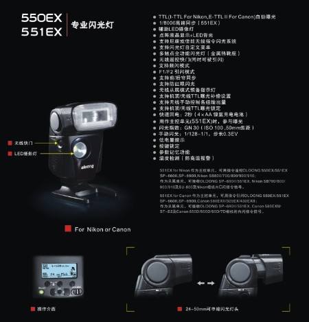 那就是来自香港沃龙的551EX,这是一支不足千元的高速闪光灯。它外形小巧,功能十分齐全,包括高速同步、无线主控、无线从属,离机高速同步、TTL自动闪光、无线快门等丰富功能。不过沃龙551EX只有尼康版本,而佳能版本上市时间预计是2013年初。