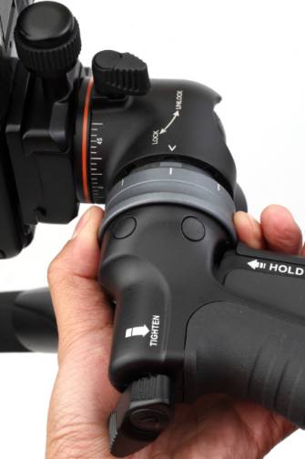 厉害的是,中轴在脚架本体上可以做上下180度和水平360的角度调节。可调的范围相当之大。