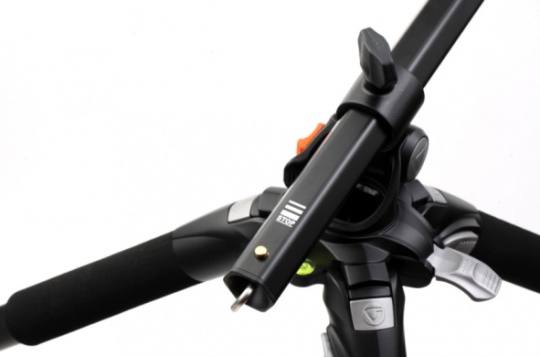 可横置的中轴是这款三脚架的特色之一。按下中轴底端的铜质弹钉,不用把中轴完全抽出就能进入横置状态。