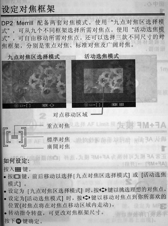1.DP2M的对焦框面积有3个大小可以选择:广阔对焦(面积最大)、标准对焦(面积居中)、重点对焦(面积最小);
