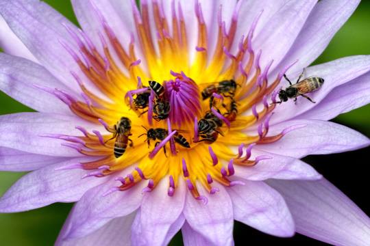 蜜蜂与睡莲(1:1裁切图)。在泰国街头、寺庙、皇宫等场所,通常都能看到盆栽睡莲,花朵中有很多蜜蜂,但是这个蜜蜂不是我们常见的那种(中国的养殖种是意大利蜂(意蜂、西峰)和中国蜜蜂(中蜂)),热带的这种蜜蜂个头很小,最大的可能性是“黑小蜜蜂”(分布于中国云南海南等南方、南亚和东南亚),但也可能是“小蜜蜂”(主要分布热带非洲),本人不能确定,有知道的吼一声吧,谢谢哦~