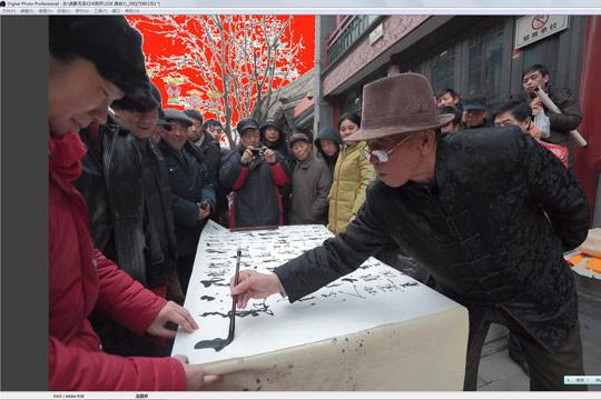 从原理上讲,单体像素的扩大,让其可以在一次曝光中承载更多的光线信号,这意味着曝光过度、形成高光位飞白的亮度临界点被进一步提高。图12可以说明这一问题:该图天光部分和书法长卷全部位于画面中最亮的高光位,若是单个像素较小的机型,可能二者都处于曝光过度高光飞白的状态。而得益于1DX大体积单个像素带来的宽广画面宽容度,即使书法长卷的亮度差与天光相比极其微小,1DX在未开启“高光色调优先”功能下,依然可以凭借默认的宽容度摄影,保证书法长卷高光位的准确曝光,这一点通过在佳能DPP软件中开启“高光警告”查看,可以清楚地观察到图13。